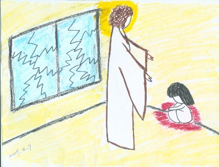我想了想,說:那個房子黑黑的,很可怕,然後那個小孩子受傷了,所以耶穌來安慰這個小朋友,耶穌來的時候,房子裡就充滿了光。